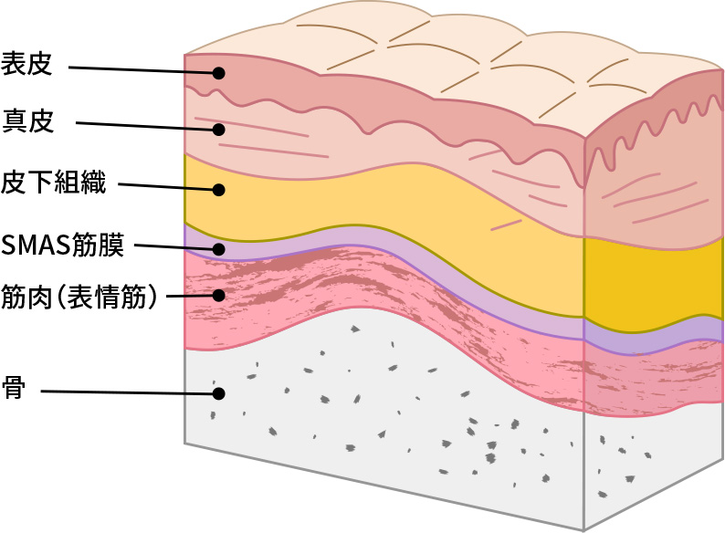 フェイスリフトを検討するうえで重要なキーワードが「SMAS(スマス)筋膜」です。SMAS筋膜とは表情を作る筋肉を覆う薄い筋膜のことです。この筋膜は表情筋と連動しています。フェイスリフトでは手術時にたるんだ皮膚を引き上げるだけではなく、その下のSMAS層を同時に引き上げる必要があります。この処置によりたるみの原因の根本を改善し、強いリフトアップ効果が発揮されるのです。