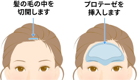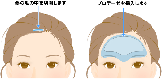 額プロテーゼ挿入術は局所麻酔下で行います。額の中央部、生え際から2センチ程上の毛髪部分を切開します。骨膜下(骨膜と骨の間)へ医療用シリコンプロテーゼを挿入します。切開幅は4センチ程度です。毛髪内のため、傷跡が目立つことはありません。丁寧に縫合して終了です。手術時間は60分程です。
